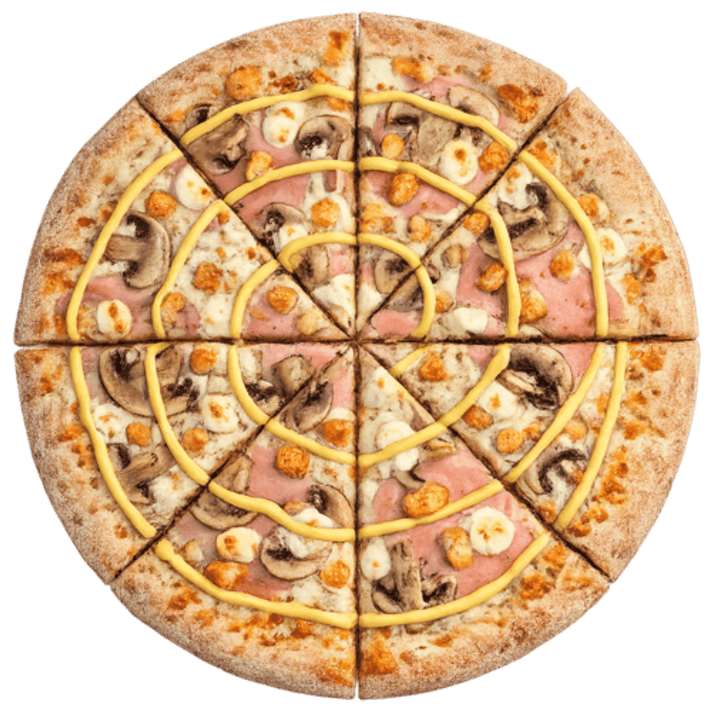 Соус - чесночный ранч Состав - ветчина куриная, курица, шампиньоны, сыр моцарелла, сыр фета, горчичный соус