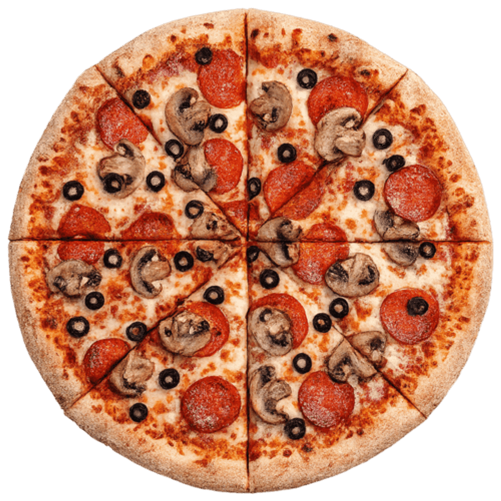 Соус - томатный Состав - пеперони, шампиньоны, сыр моцарелла, маслины