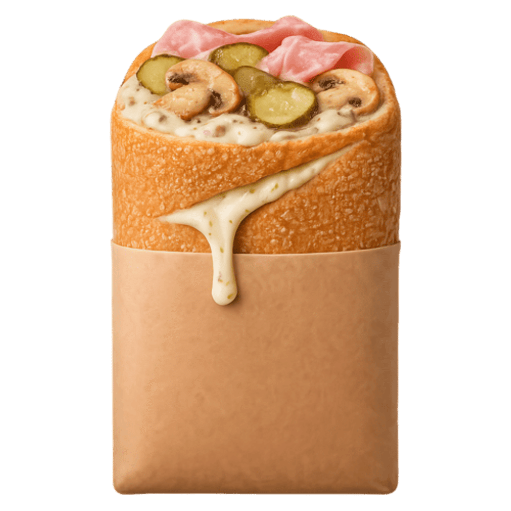Соус - грибной Состав - сыр моцарелла, ветчина, шампиньоны жаренные, огурцы маринованные