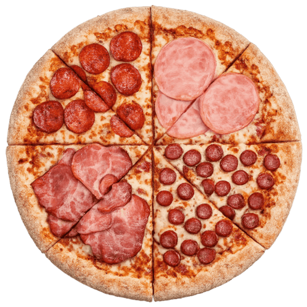 Соус - томатный Состав - грудинка, ветчина куриная, охотничьи колбаски, пепперони, сыр моцарелла