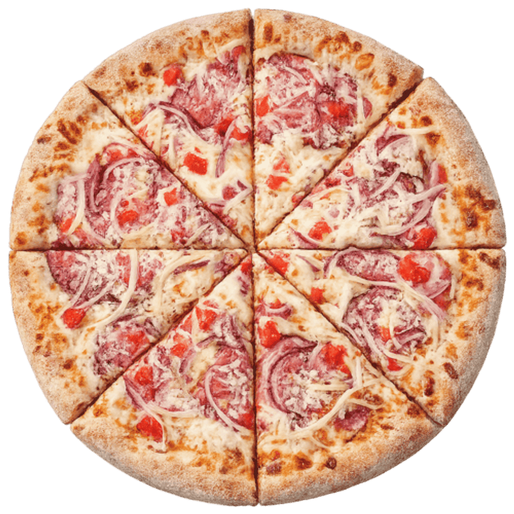 Соус - чесночный Состав - грудинка, красный лук, сыр моцарелла, томаты, пармезан