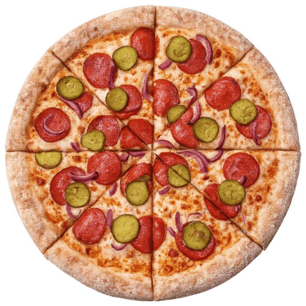 Соус - 1000 островов Состав - пепперони, красный лук, сыр моцарелла, огурцы маринованные