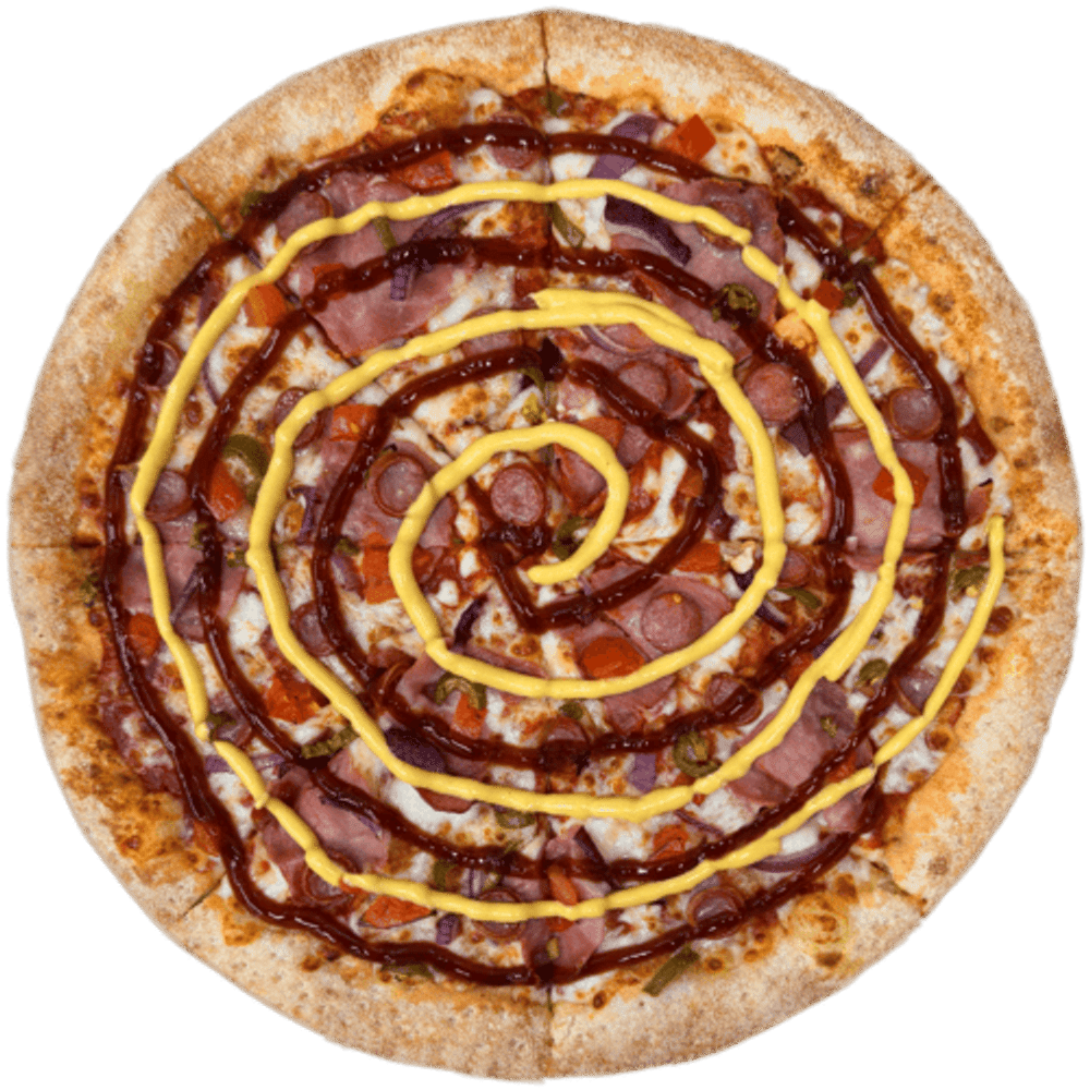 Соус - томатный Состав - грудинка свиная, охотничьи колбаски, красный лук, сыр моцарелла, томаты, острый перец халапеньо, горчичный соус, барбекю соус
